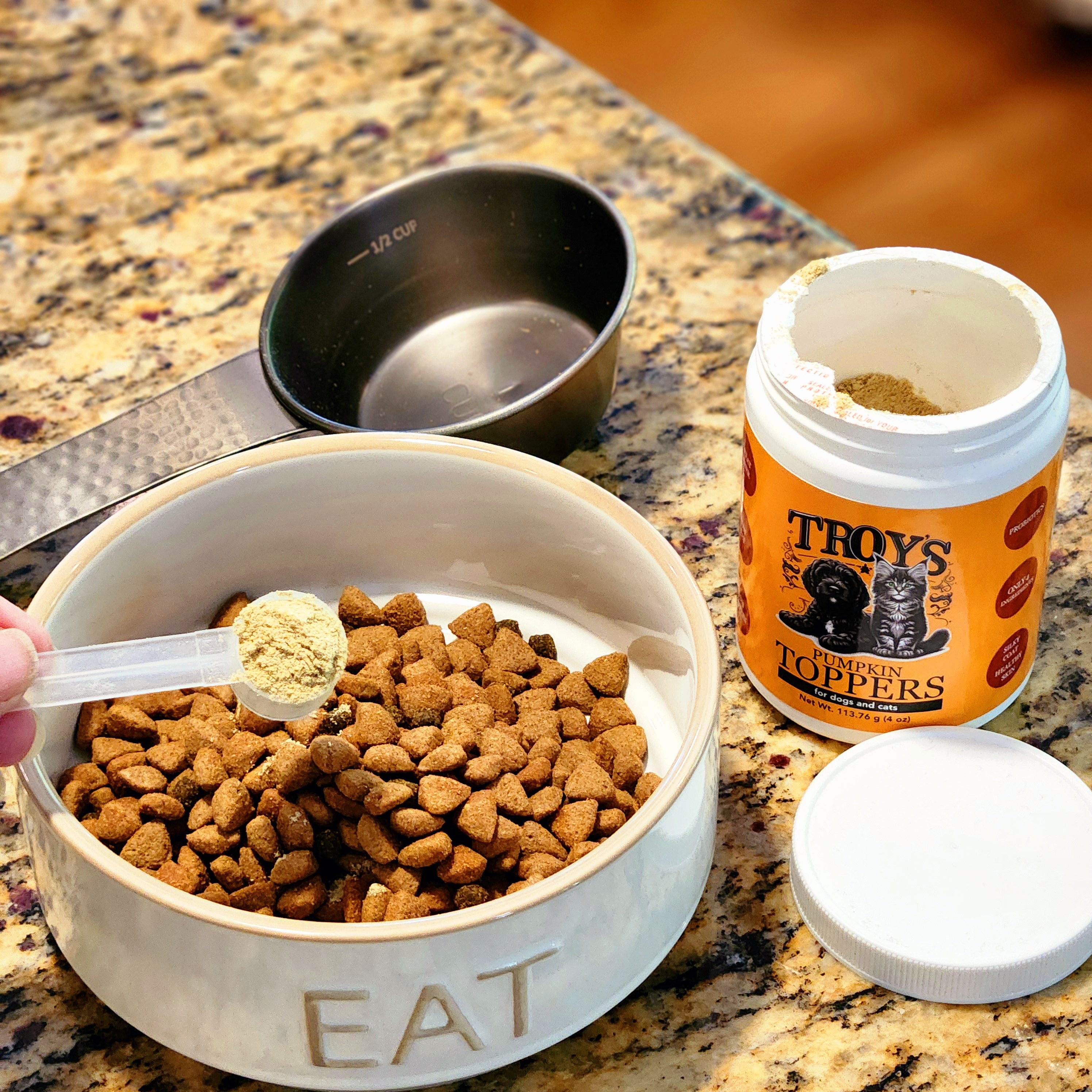 Sprinkle 1 scoop, for every 25 pounds, over dry or wet food for your dog or cat. Adjust based on your pet’s size and dietary needs.